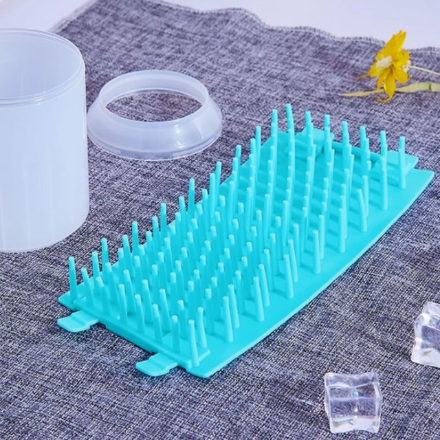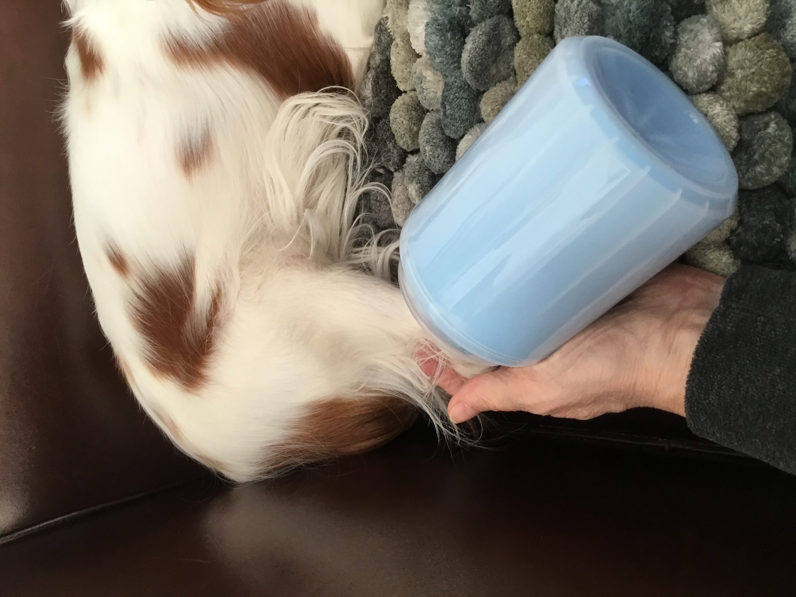 My chihuahua reluctantly agreed to let my grandson clean his paws with this paw cleaner. It consists of a sturdy plastic cup with soft, silicone fingerlets inside for cleaning. Just fill the cup about 3/4 full with warm soapy water and put the dog’s paw in a few times. The paw comes clean in a jiffy. Repeat on the other 3 paws. It can be used on a little or a big dog. It’s portable so it’s good to take camping, to the park, or to use at home.